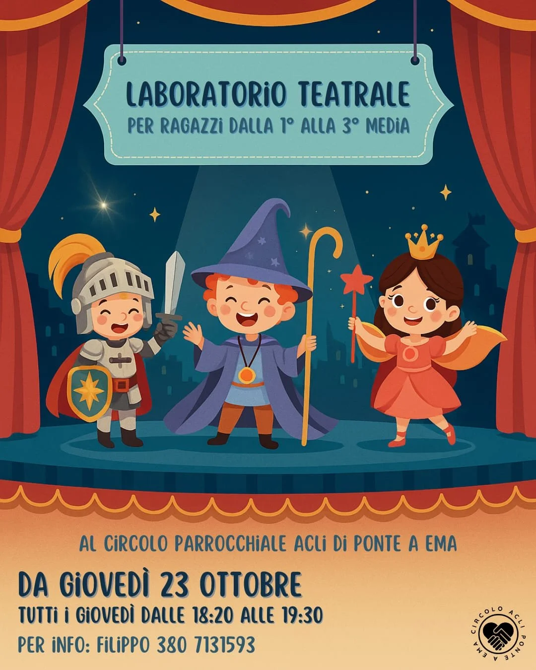 Al Teatro ACLI di Ponte a Ema il teatro è più di un’arte: è un modo per entrare in relazione, per esprimersi, per riscoprirsi attraverso le storie. I nostri corsi sono aperti a tutti — bambini, ragazzi e adulti — e offrono uno spazio accogliente e creativo dove sperimentare la scena, la voce e l’immaginazione.