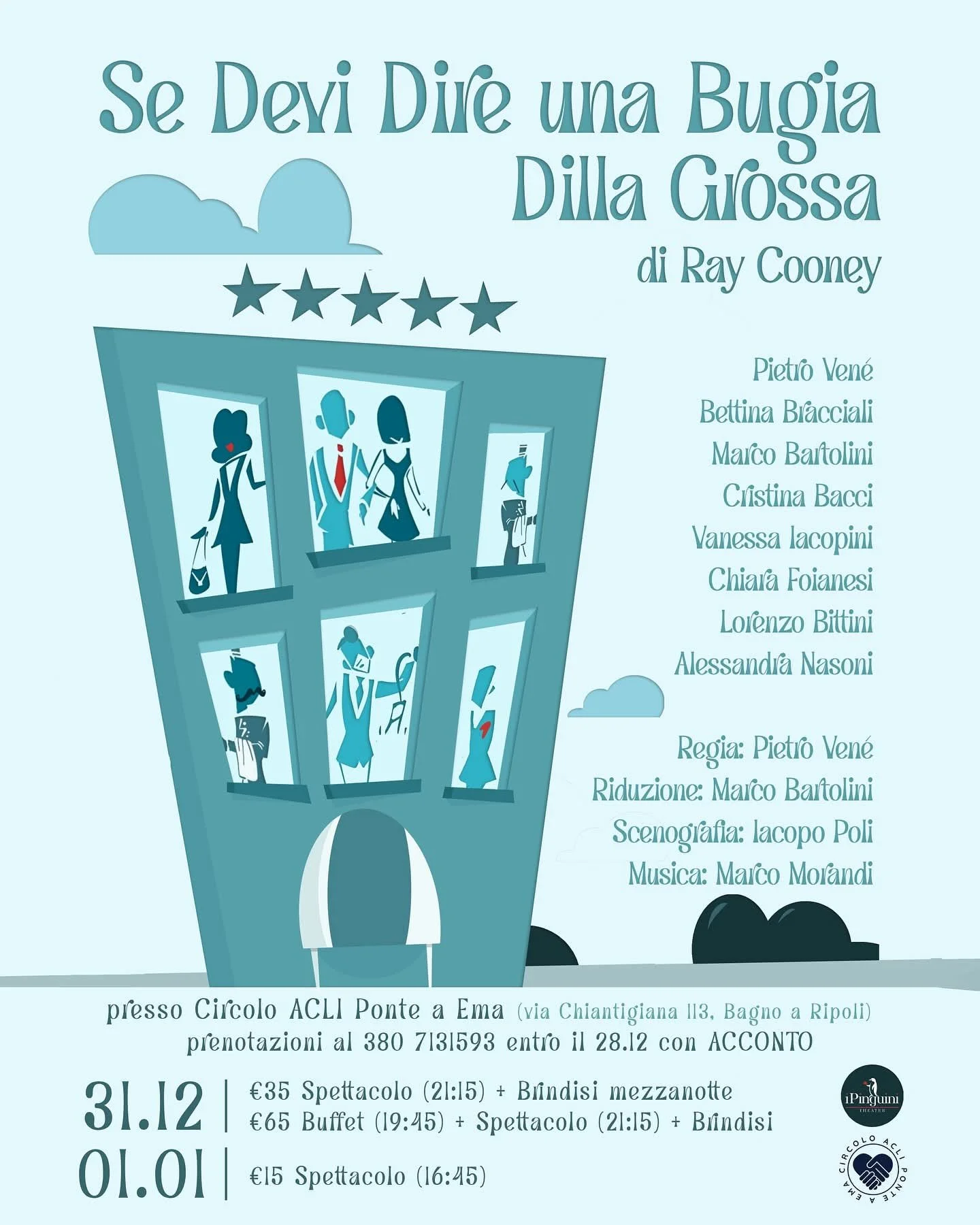 Partendo da una gustosa cena, seguita dal divertentissimo spettacolo “Se Devi Dire Una Bugia Dilla Grossa” e per finire… Brindisi e panettone per tutti!